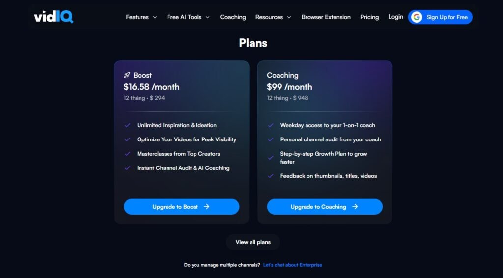 - Boost Plan ($49/month): Advanced AI tools, competitor tracking, and video optimization