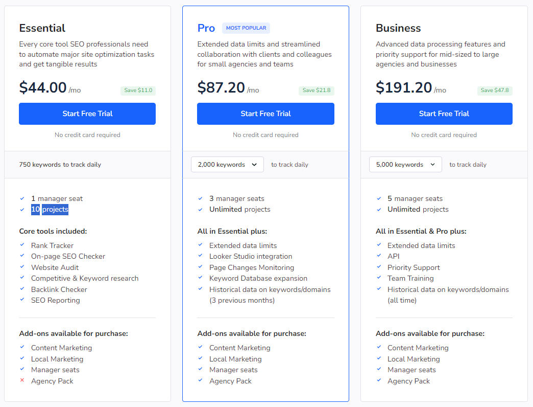 A: SE Ranking offers a variety of pricing plans to suit the needs of businesses of all sizes. The Essential Plan starts at $29 per month when billed annually. The Pro Plan starts at $49 per month when billed annually. The Business Plan starts at $191 per month when billed annually.