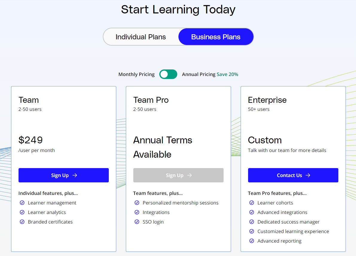 - Team: Udacity offers Team plans for businesses that want to provide their employees with access to Udacity’s courses and Nanodegree programs. These plans start at $2,995 per month.